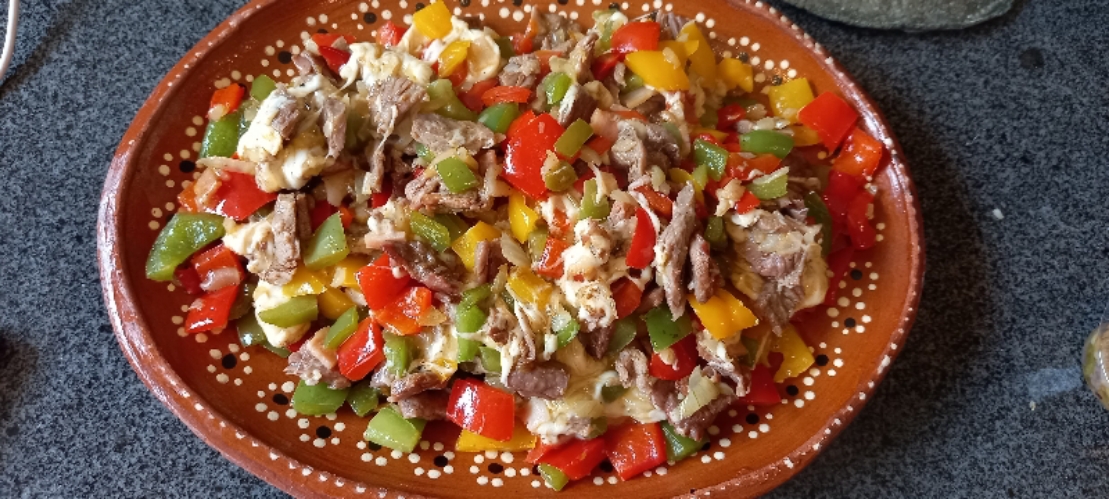 Arrachera,jamón,tocino,queso amarillo y queso Oaxaca con papas